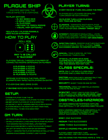 Plague Ship is a TTRPG that a GM runs for 2-6+ players trying to escape a ship with a deadly virus before becoming infected. It is a difficult survival challenge that requires cooperation to succeed. If one player gets to the end alive, the group wins. If no one makes it out alive the group loses.